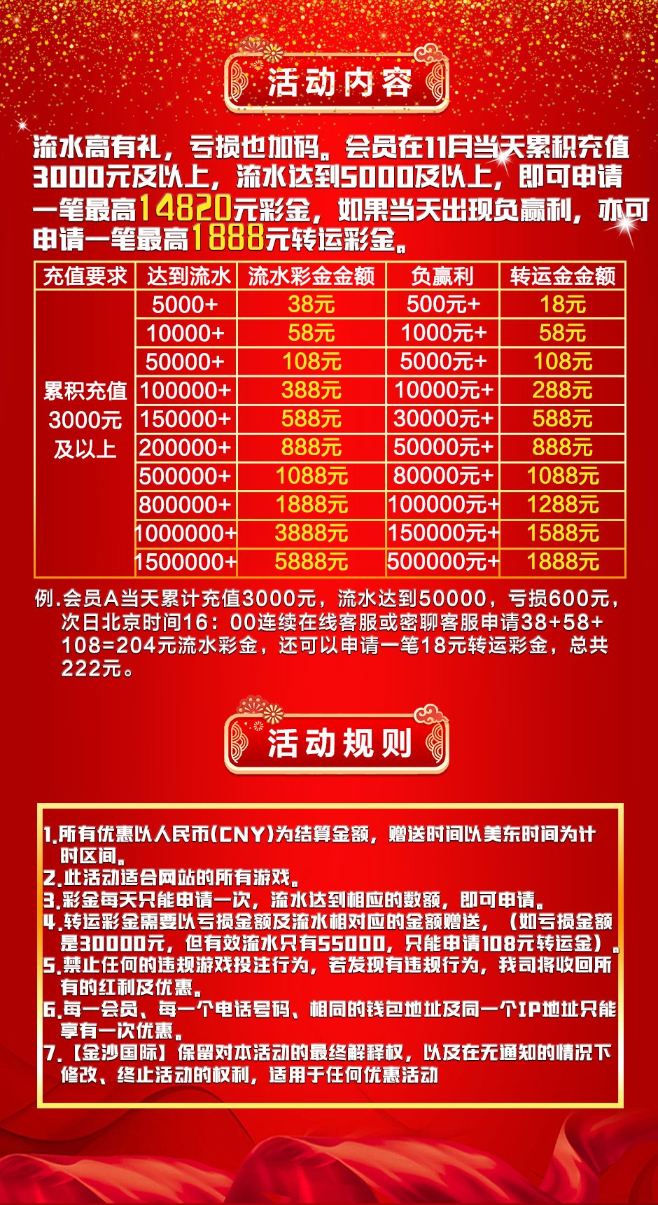 2020年12月1日起,金沙国际开启全新的优惠活动,当天累积存款100元及以上金额,次日就可以领取最高彩金38888元
